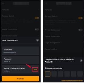 لتعطيل تطبيق Google Authenticator على الحساب الفرعي، تحتاج إلى فتح علامة التبويب الحساب الفرعي بالنقر على صورة ملفك الشخصي في الزاوية العلوية اليسرى. اضغط على زر المزيد للحساب الفرعي المعني واضغط على الإعدادات ← إدارة تسجيل الدخول ← إلغاء الارتباط.