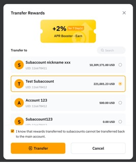 يتم دعم تحويل المكافآت فقط للحسابات الفرعية بطراز UTA Standard. الأنواع الأخرى من الحسابات الفرعية مثل حساب Trader Master الفرعي، حساب Custodial Trading الفرعي غير مدعومة.