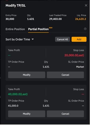 يمكن للمتداولين تعيين أوامر TP/SL متعددة وتحديد كمية الطلب من خلال وضعية جزئية. ستتم تنفيذ كمية الطلب لأوامر TP/SL الجزئية حسب كمية الطلب المحددة أو الحد الأقصى لكمية العقد لمركزك المفتوح، أيهما أقل، وسيتم إلغاء أمر SL (أو TP) المقابل. لن يتم إنشاء وضعية في الاتجاه المعاكس.