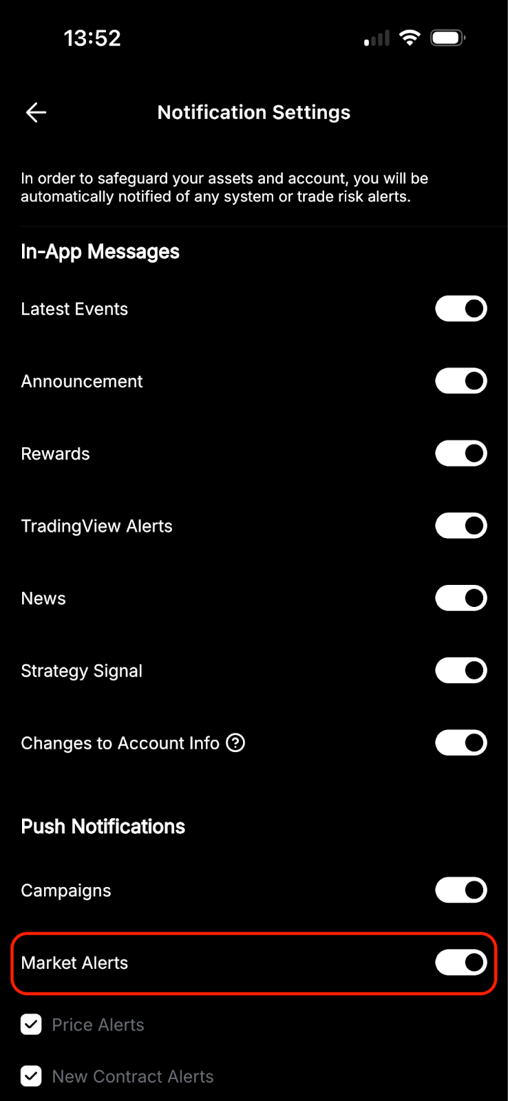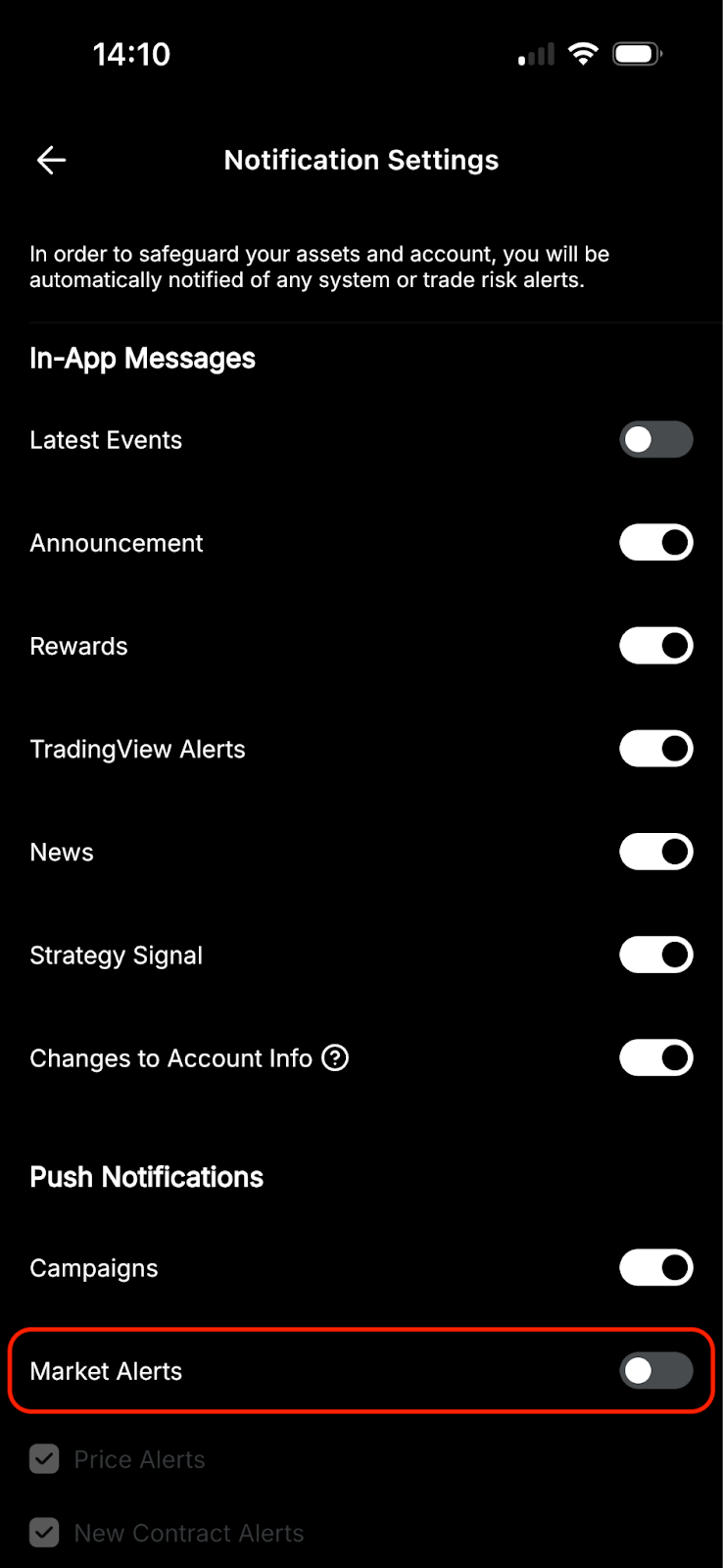 The Notifications Settings page lists different types of alerts you can receive that you can activate or deactivate as you wish. To do so, use the switch on the right side of the tab of your interest. When in white, it will be activated, and when in gray, the alerts will be turned off.