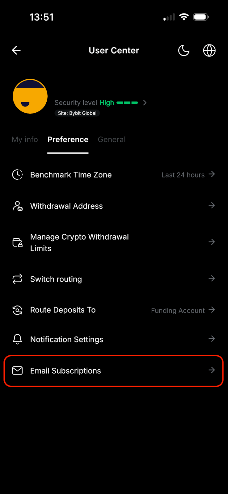 To turn off Bybit’s Email Subscription, you may go to the Settings page by clicking on the profile icon on the top left corner of the homepage and clicking on the Settings icon. Then, click on Preferences → Email Subscriptions, where you can customize which Event Reminders and General Announcements you wish to receive on your registered email address.