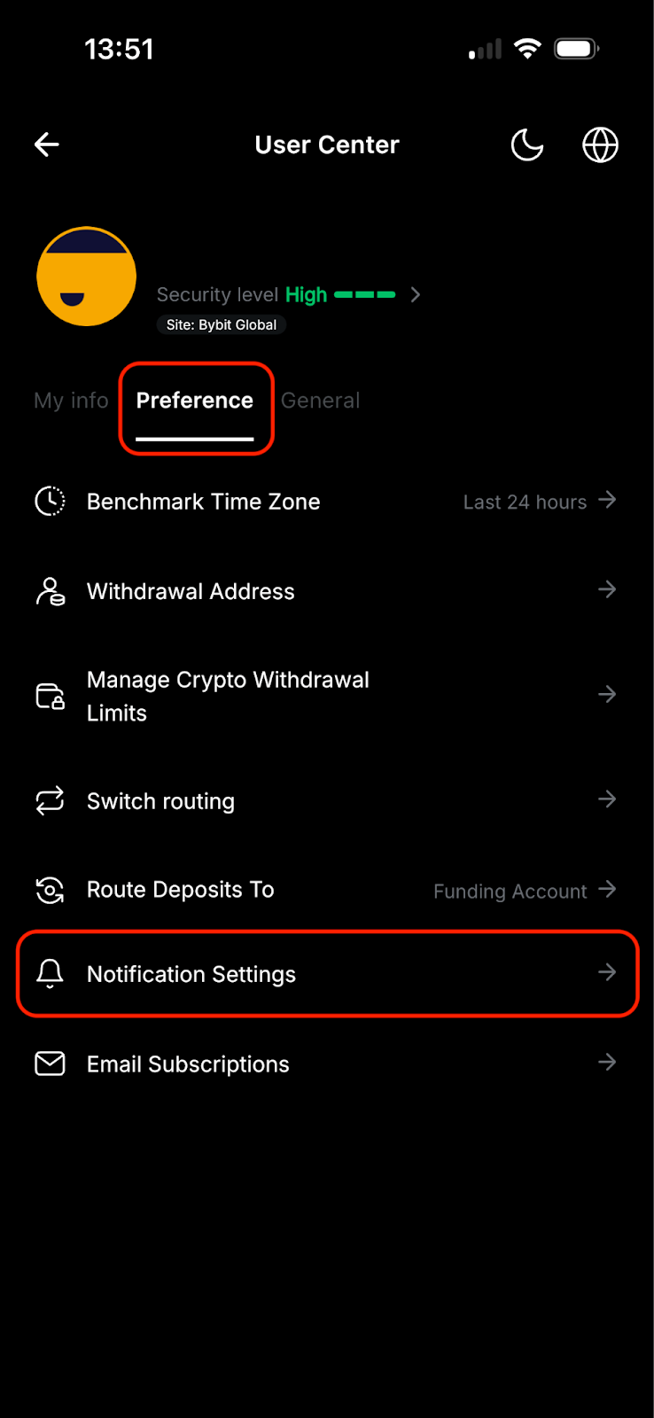 To turn off Bybit’s Market Alerts, you can go to the Settings page by clicking on the profile icon on the top left corner of the homepage and clicking on the Settings icon. Then, click on Preference → Notification Settings, where you can define the type of notifications you want to receive on your phone from the Bybit App.
