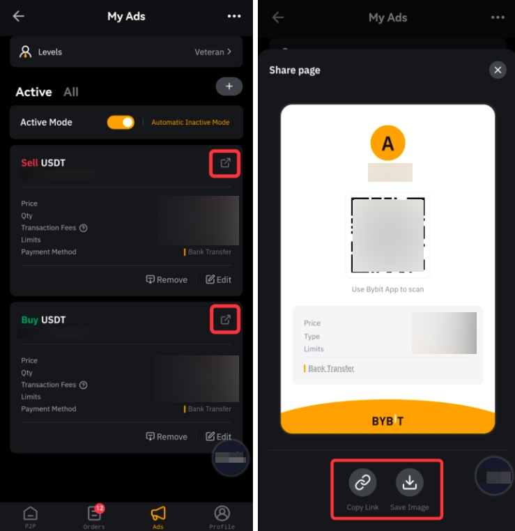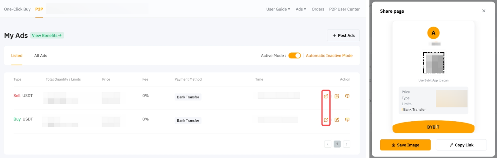 You can share your ads via a QR code or a URL link. The ads can be set to public or non-public. Public ads are visible on the P2P advertisement page while non-public ads are only accessible to traders who have the QR code or the URL link.