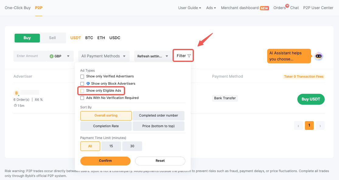 According to Bybit’s P2P Advertising Sorting Rules, the Top Picks for New Users is the current top priority displayed on the P2P advertisement page.