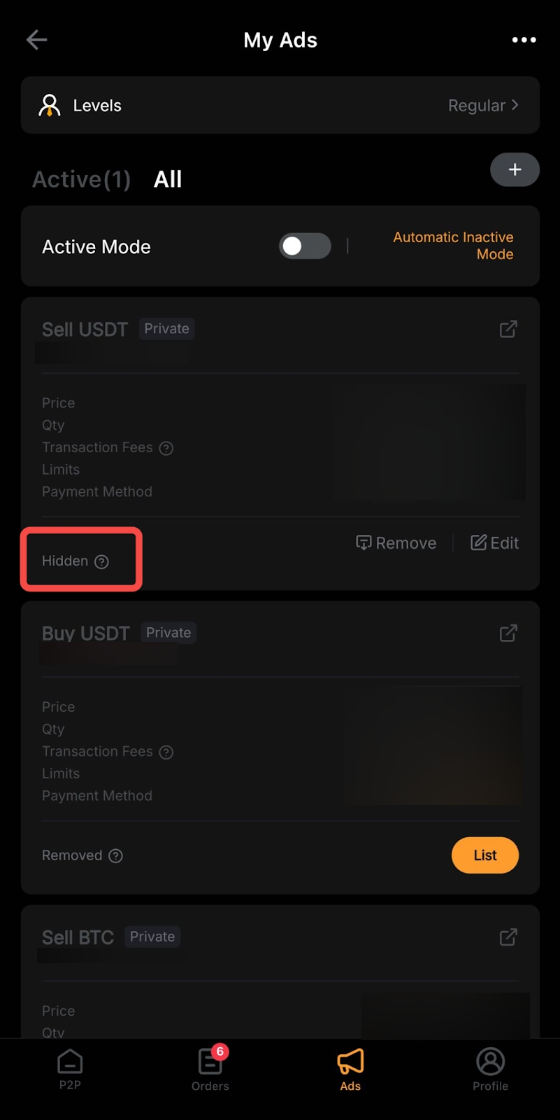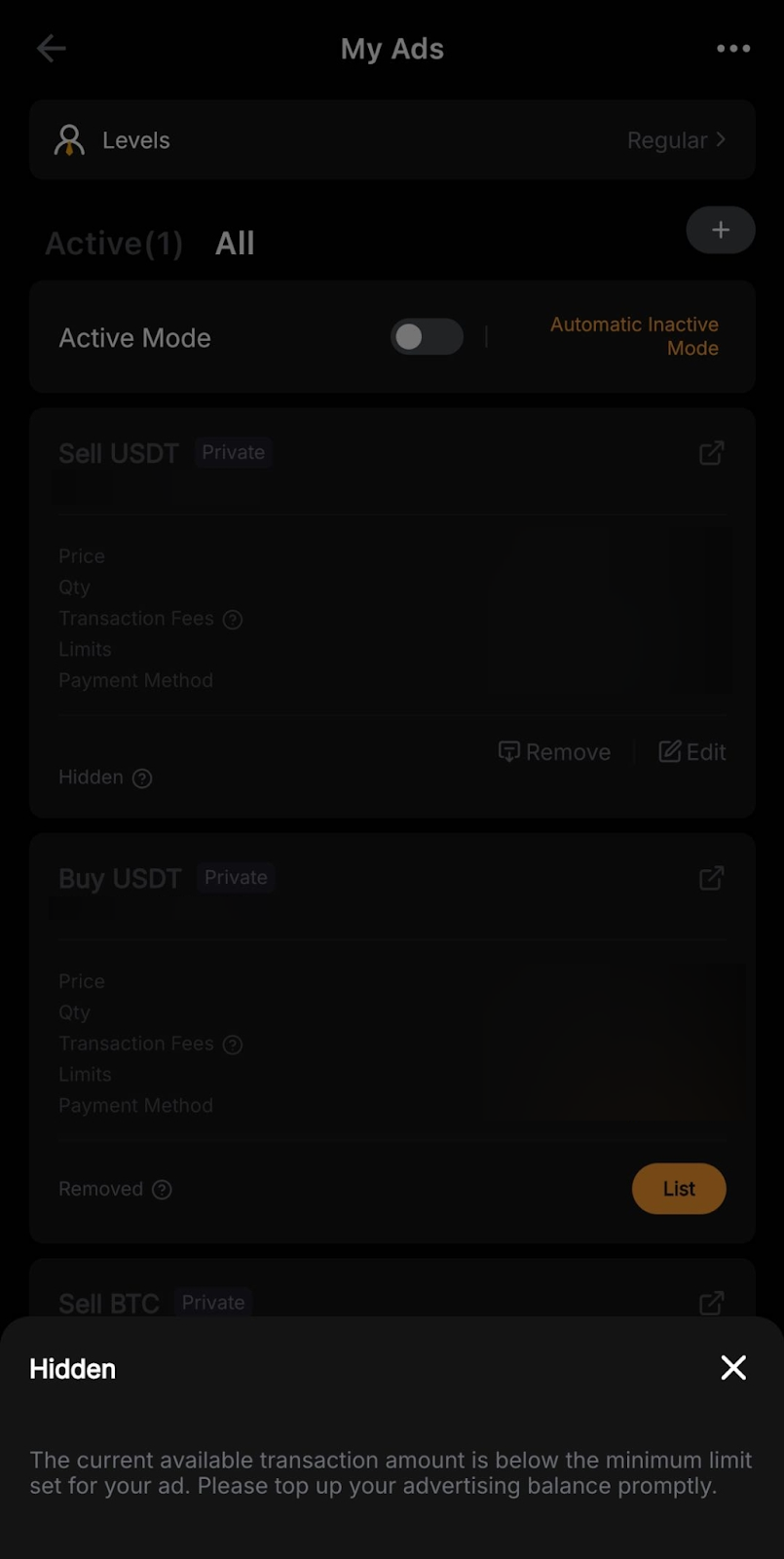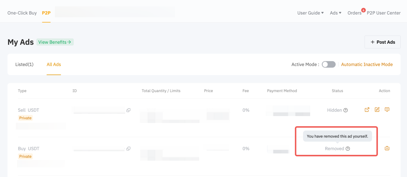 On the App, go to P2P Trading → Ads → All to view the list of removed or hidden ads. Then, click on the Status to view the reasons.