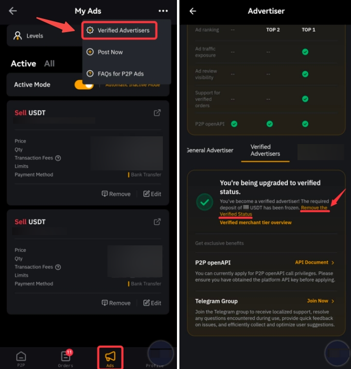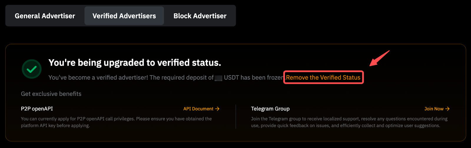 Please note that once your Verified Advertiser status is removed, you will no longer be eligible for its benefits. To learn more about the advantages of being a Verified Advertiser, please visit the P2P Advertiser Program page.