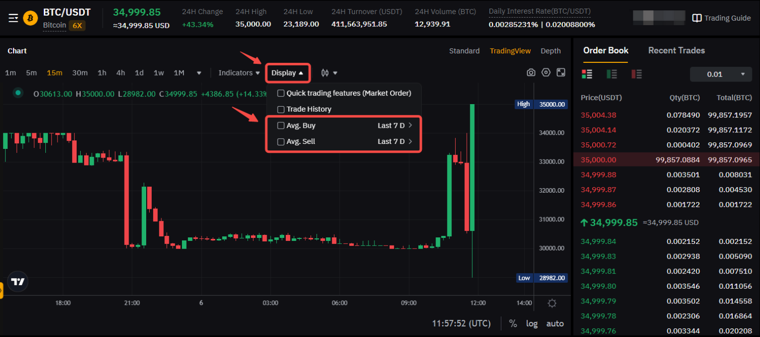 When trading on Spot, you can display the average price of your Sell and Buy orders directly on the trading chart. To activate it, click on Display and tick the average price you would like to see. You can also select the period on which the average will be calculated (last 7, 30, 60 or 90 days). Please note that the average price will be calculated from the current day to the last day of the selected period.