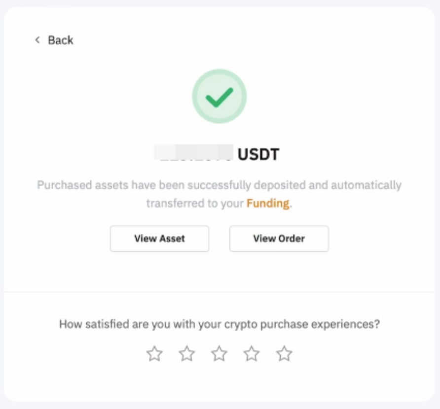 Step 5: Your transaction is complete. The coin will be deposited into your Funding Account within 1–2 minutes. Click on View Asset to check your balance. You will receive your order status by email and push notifications if they are enabled.