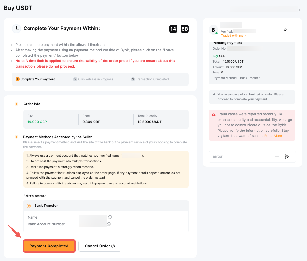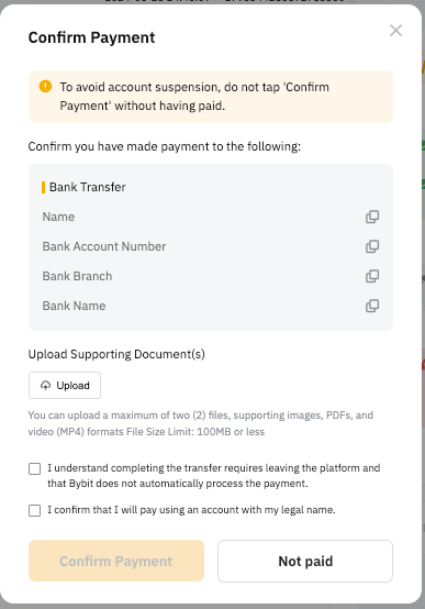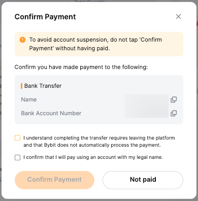 — Your bank account name must be consistent with your registered name on Bybit. Otherwise, your account might be suspended and you may encounter permanent asset loss as the seller has a right to refuse to release the coin to you.