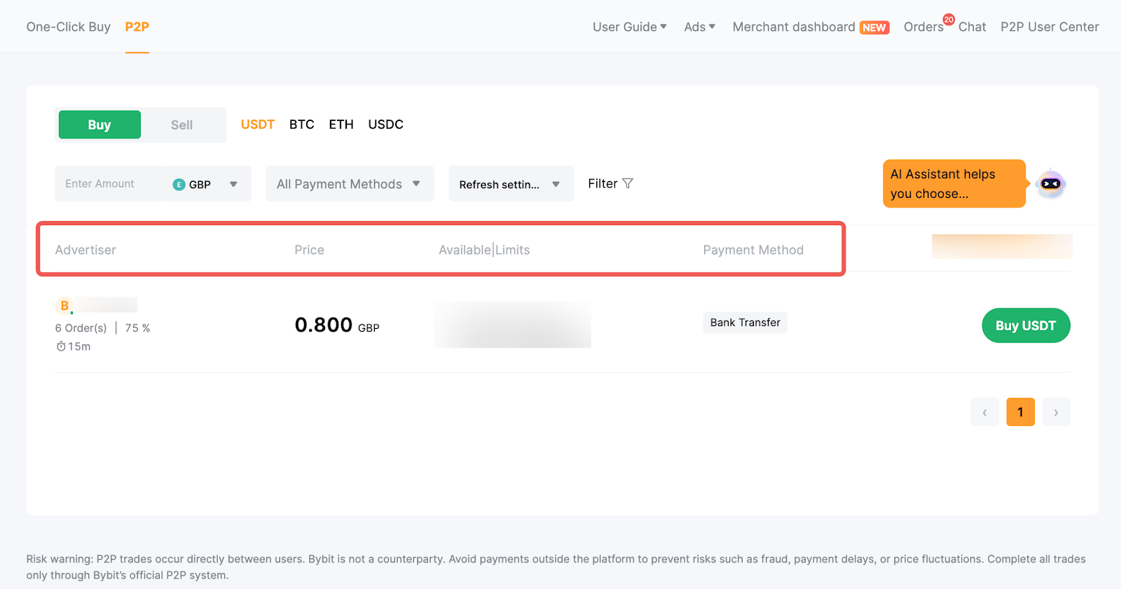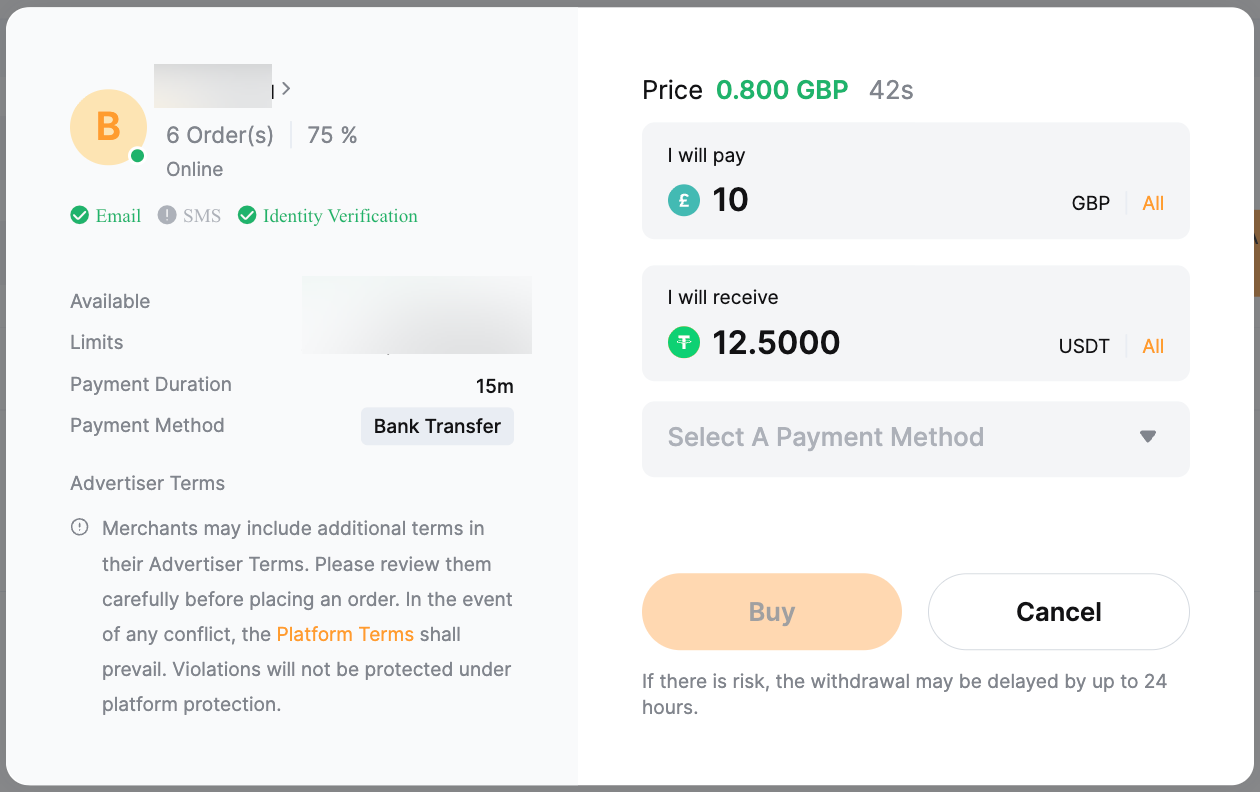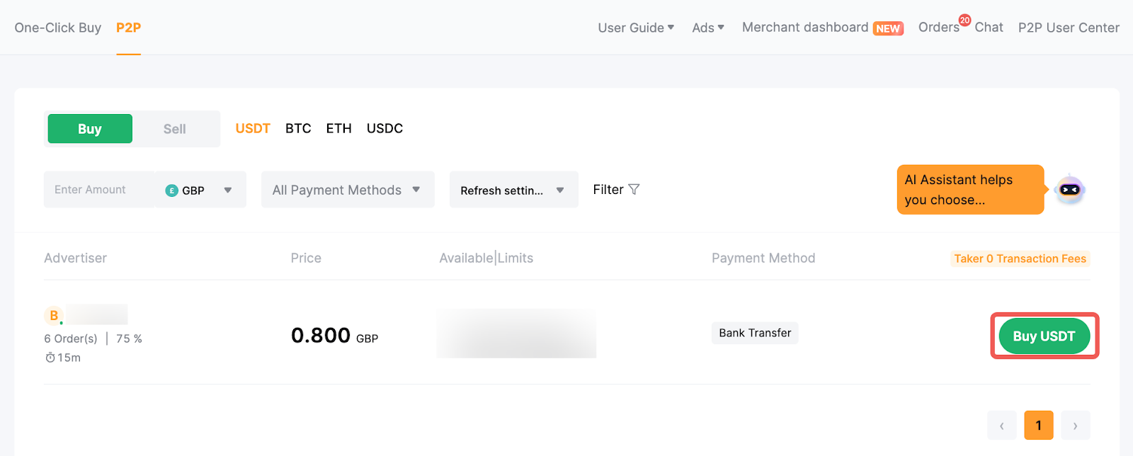 — The Available/Limits column displays the available balance for each advertisement as well as the minimum and maximum transaction limits per order, in fiat terms.
