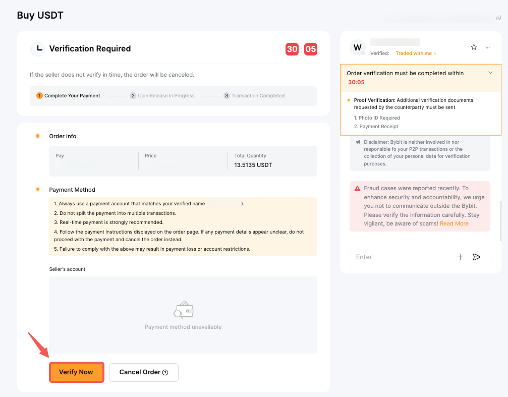 You’ll be redirected to a page where you will see a countdown timer to complete the verification. Click on Verify Now and provide the required proofs in the Order Chat Box.