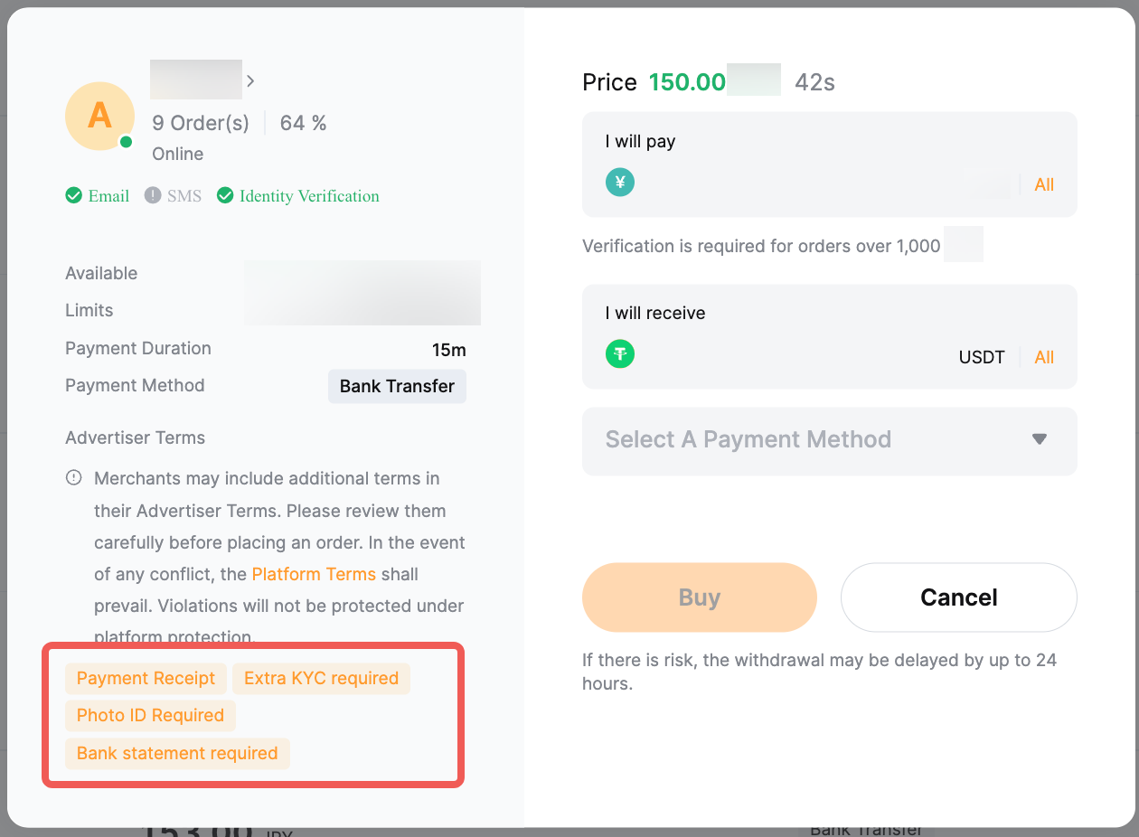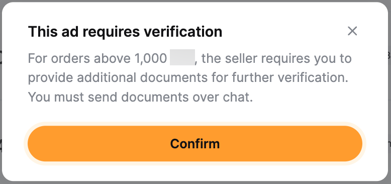 — The Verification Required refers to the Verified Advertiser (VA) requesting the takers to provide certain proofs before proceeding with orders. The proof might be a liveness check, photo ID, proof of payment, bank statement or additional identity verification.