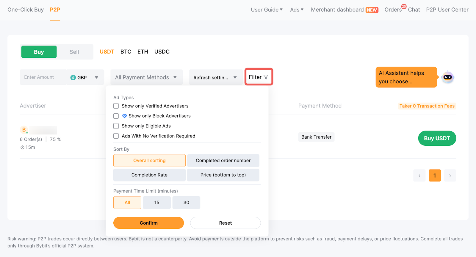 — P2P on Bybit offers zero transaction fees for either buyers or sellers. However, please note that traders may need to pay transaction fees to the payment provider based on the payment method selected.