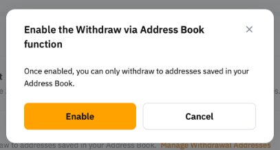 Step 2: A pop-up window will open for you to confirm that you want to enable the Withdraw via Address Book function. Click on Confirm.