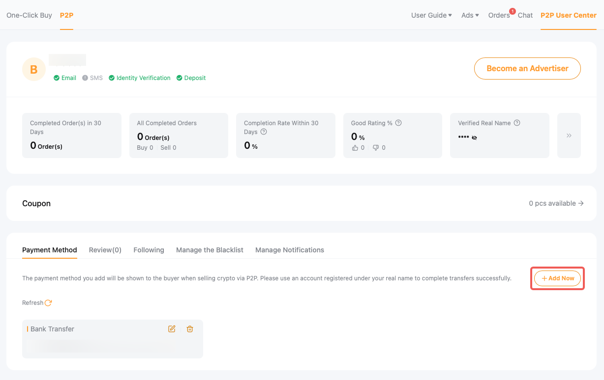Click on Manage Payment Method and you will be directed to the P2P User Center to add your payment method.