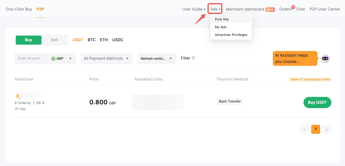 Step 2: In the upper-right corner of the P2P trading page, click on Ads → Post My Ads.