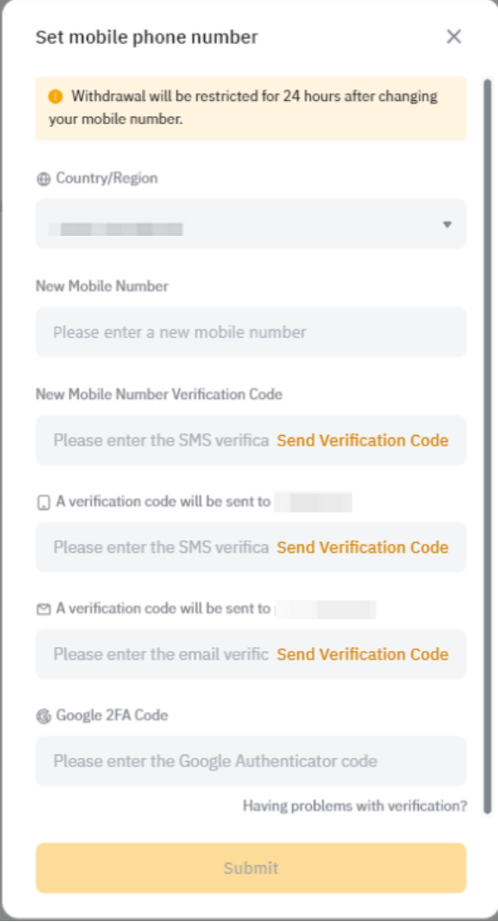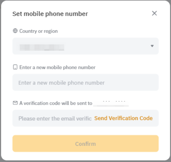 Step 2: Enter your new country code and phone number. Then, click on the different Send Verification Code buttons to proceed with the old mobile, new mobile, and/or email verification steps as well as the Google 2FA verification, if enabled. Once you have entered the required verification codes, click on Confirm.