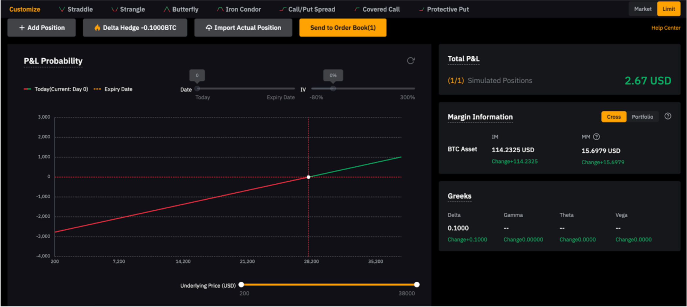To further customize your strategy, you can use Delta hedging. If there is a Delta exposure in your portfolio, the available hedging amount will be displayed on the page. To maintain Delta neutrality, you can add relevant derivatives for risk hedging.