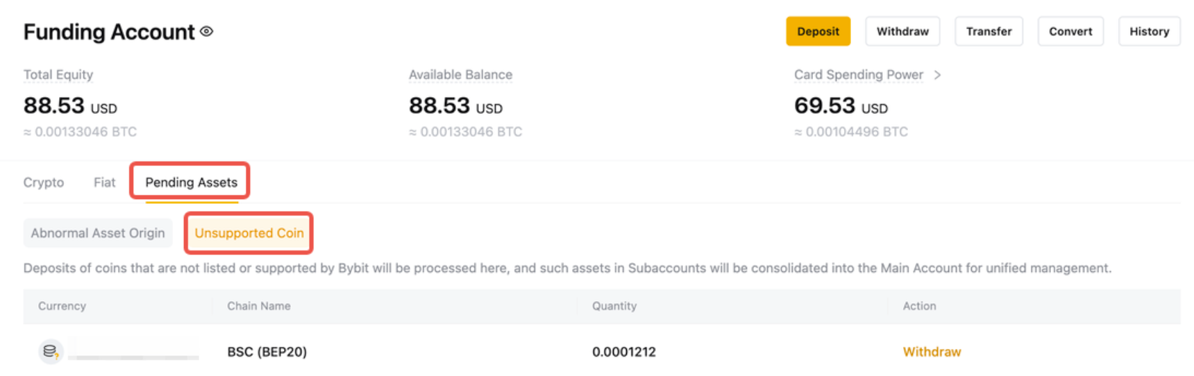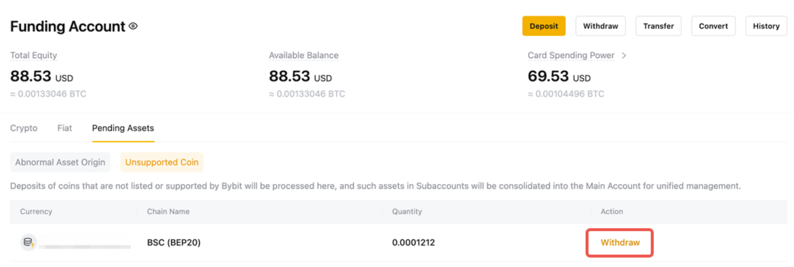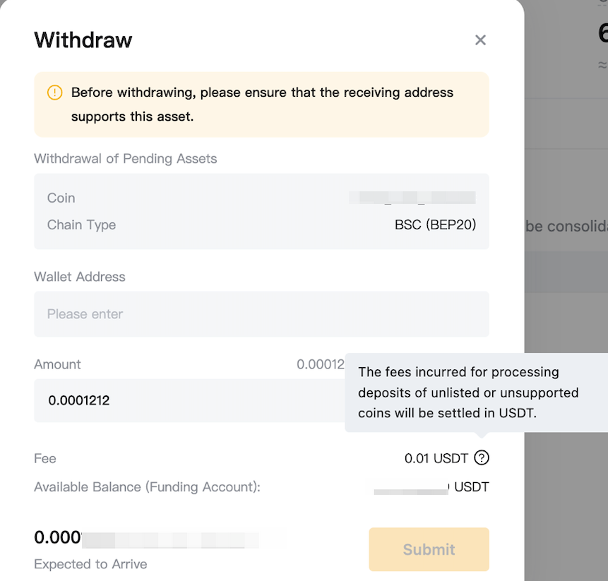 Step 3: Under Unsupported Coin in the Pending Assets section, click on Withdraw in the Action column.