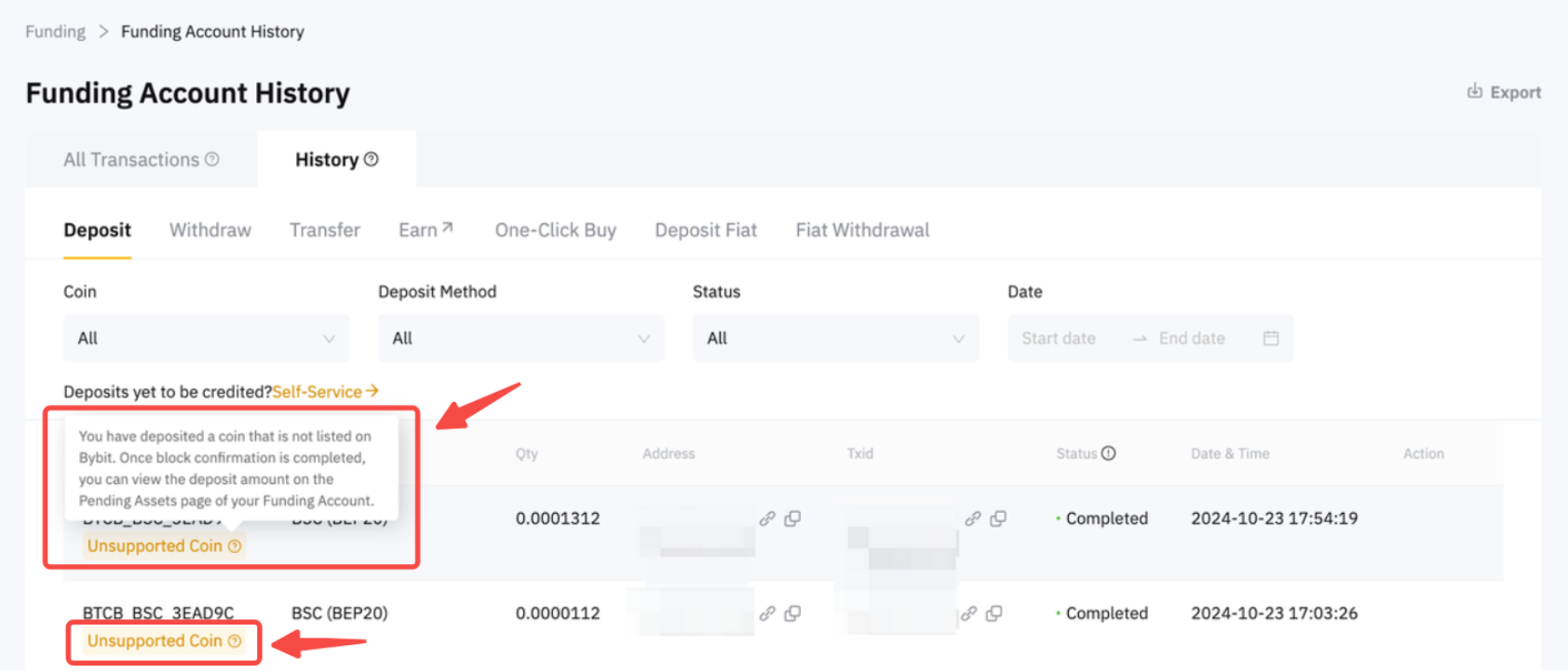 a. If you see an unsupported coin remark in the deposit record, please follow the A) Self-Service guide below which allows you to initiate a withdrawal.