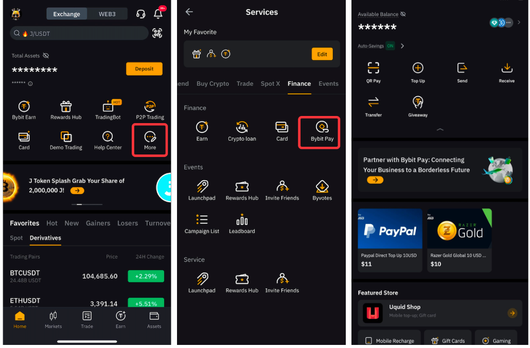 If you are on the Bybit App, first launch the Bybit App, and log in to your account. Search for Bybit Pay or tap on More located on the home page, then tap on Bybit Pay.