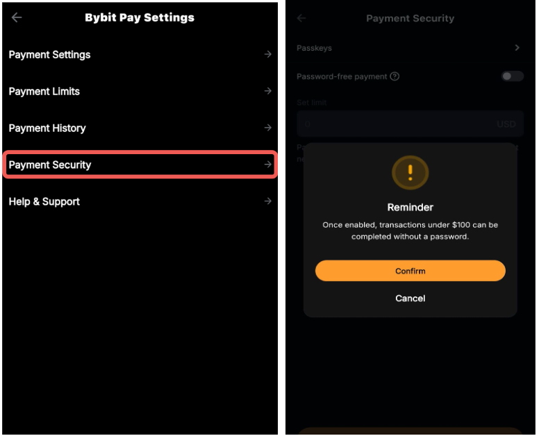 You can enable Password-Free payments from your Bybit Pay Settings → Payment Security.