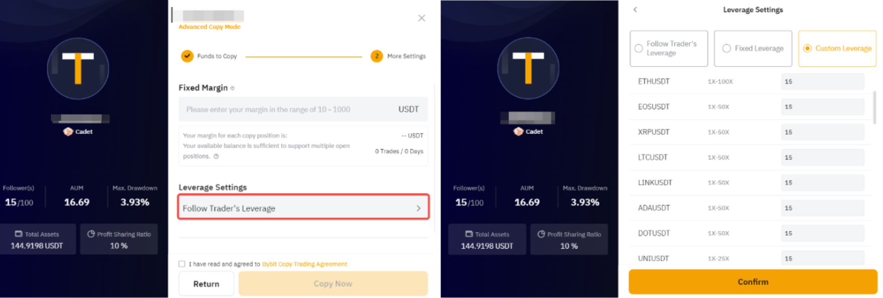 Followers can set the fixed margin for each copy trade on their own. Experienced users can select this mode to customize their order settings. |