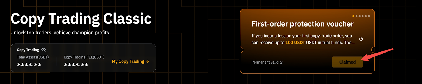 Premium Protection Voucher: It can be claimed once every quarter on the top right corner of Copy Trading Classic or Copy Trading TradFi. Within the same quarter, you're eligible for compensation—up to 100 USDT—for losses from a single eligible Master Trader. This benefit can only be used once per quarter.