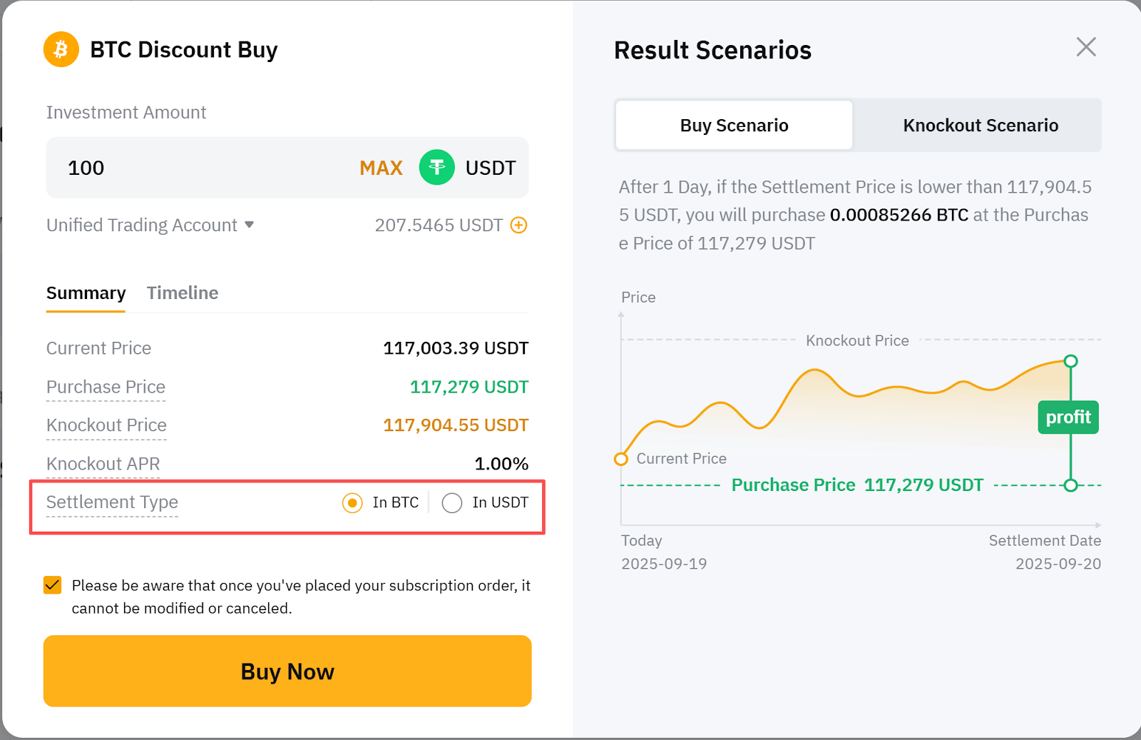 If the Settlement Price is equal to or above the Knockout Price, the purchase will not be triggered, and you will get back your principal plus interest in USDT.