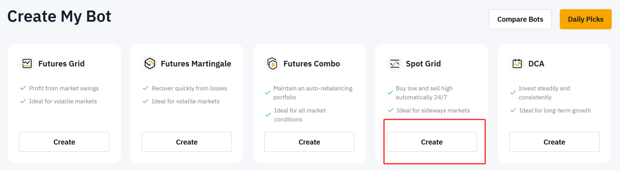 Step 1: Go to the Bybit Trading Bot page and click Create in the Spot Grid section.