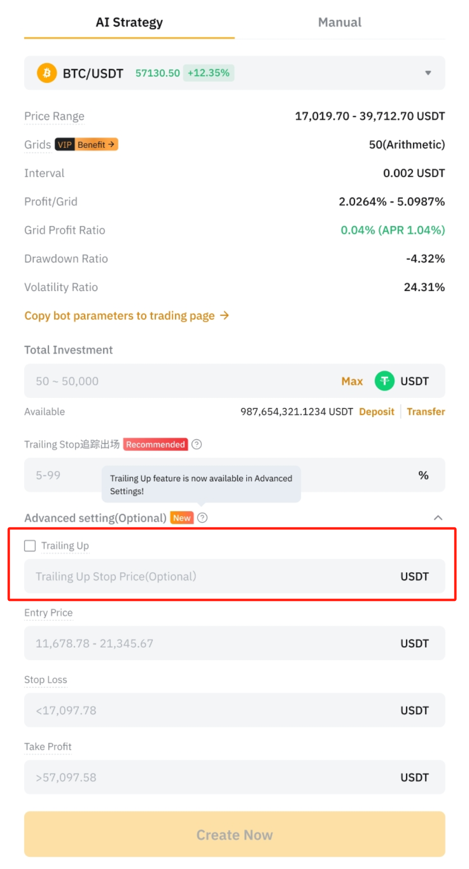 Step 2: Choose either the AI Strategy or Manual tab. In Advanced Settings (Optional), check the Trailing Up box and set a trailing up limit price if needed.