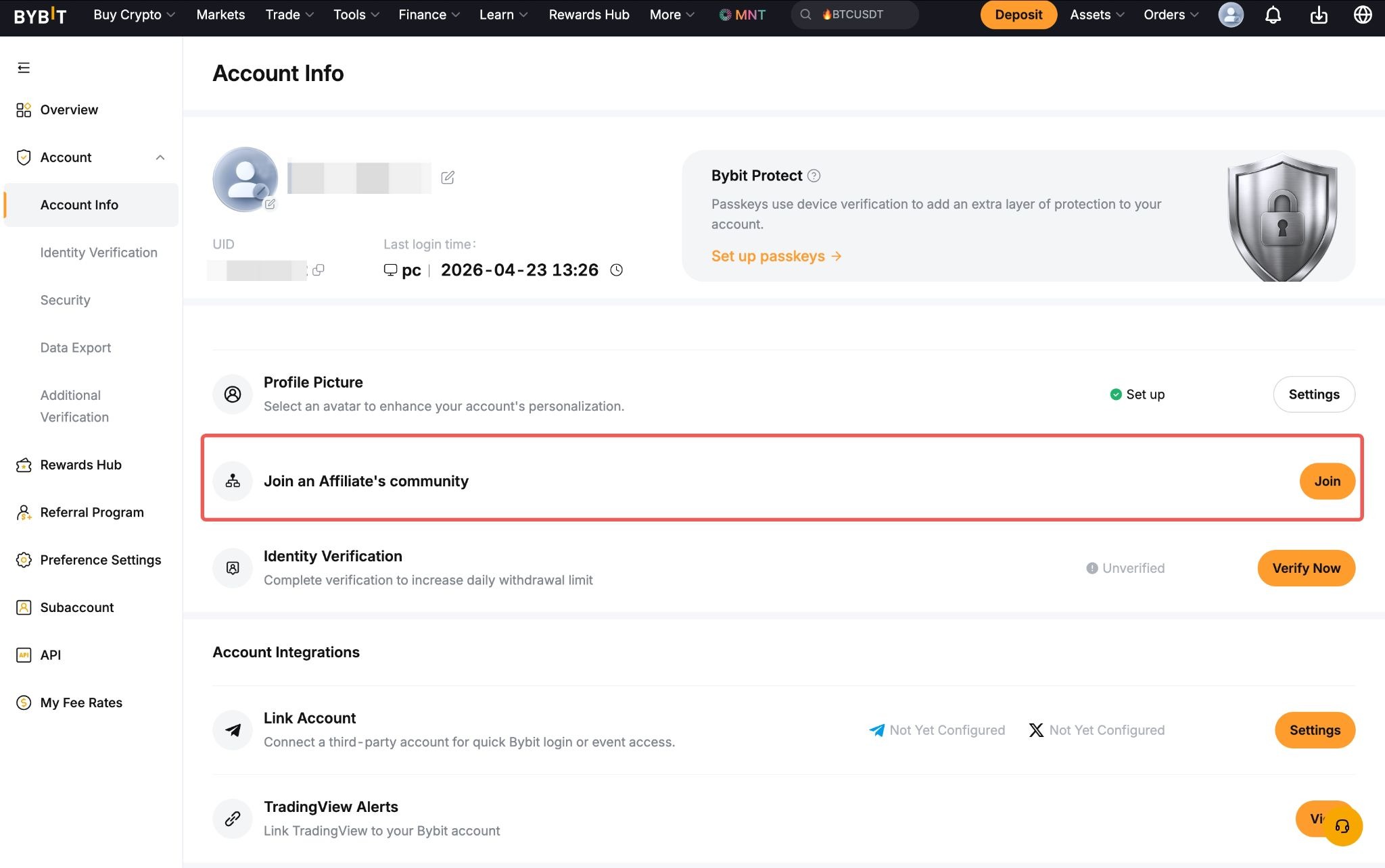 Please note that certain Affiliate IDs may not be accessible to users on the Account Info page due to Bybit affiliate partners’ privacy settings. Should you wish to identify the Affiliate ID in this case, we kindly suggest recalling where you initially registered or obtained the affiliate code (e.g., YouTube, social media platforms, or referral page).