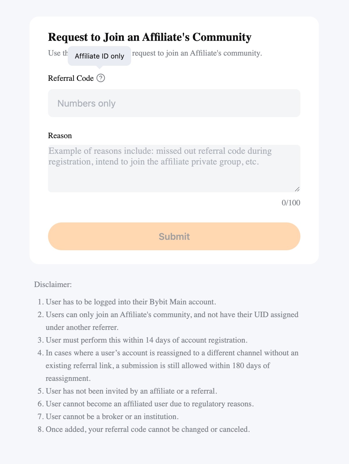 Users may have missed adding the Affiliate or KOL's invitation code during registration for various reasons. Therefore, Bybit now supports users to manually add the invitation code within 14 days after registration to join the Affiliate’s community.