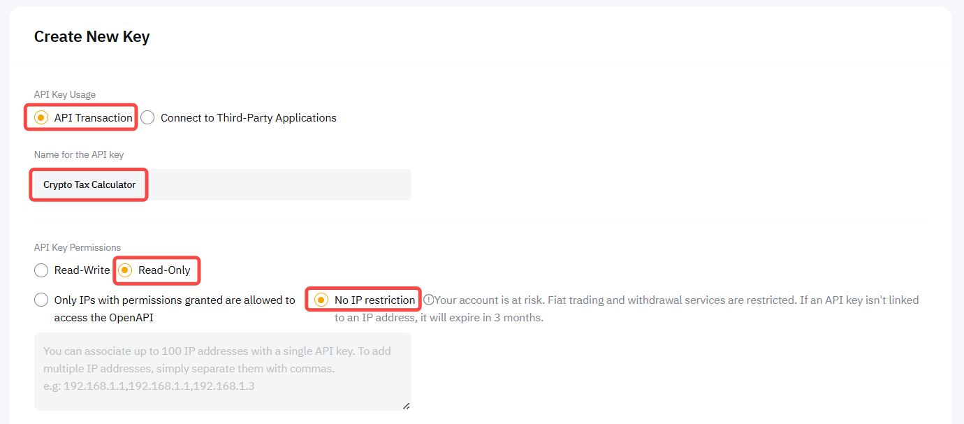 For data import via API connection, please make sure to set up your API key with the following information on your Bybit account: