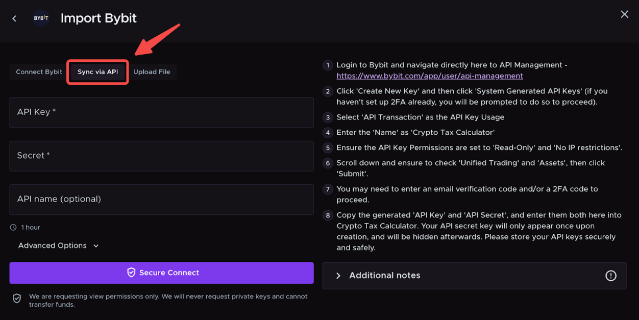 Once you have created the API Key on Bybit, select the option Sync via API in Crypto Tax Calculator and enter the generated API Key and API Secret. Click Secure Connect once done.
