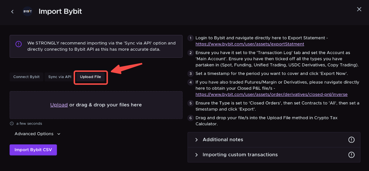 Step 3: You can choose to import your Bybit transaction data into Crypto Tax Calculator by either API connection or CSV upload.