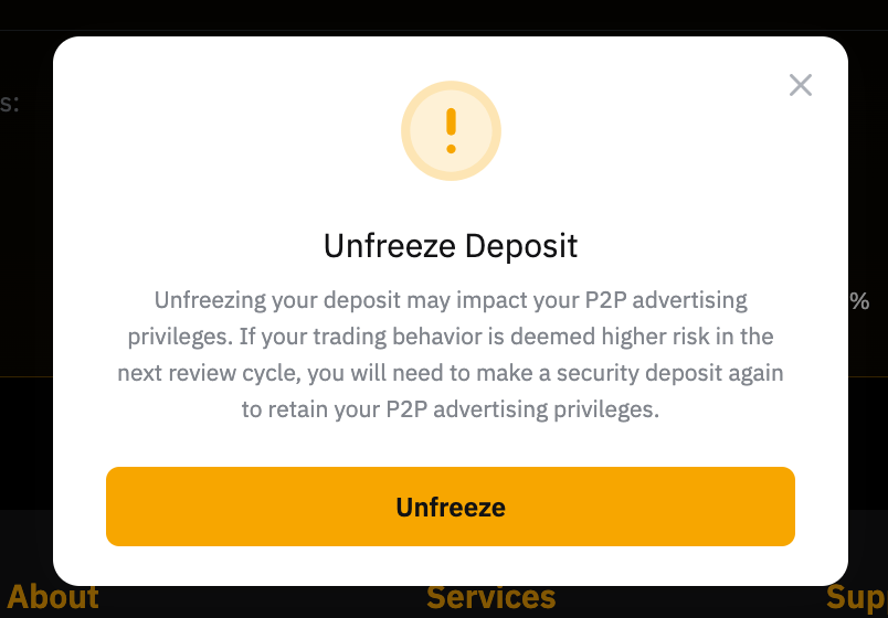 — Be aware that the unfreezing of your security deposit entails forfeiting the privilege to publish P2P advertisements. For more information, please refer to the FAQ — Security Deposit Requirements in P2P Trading.