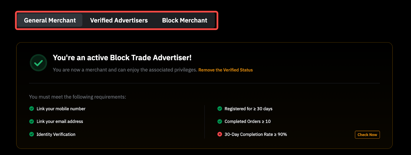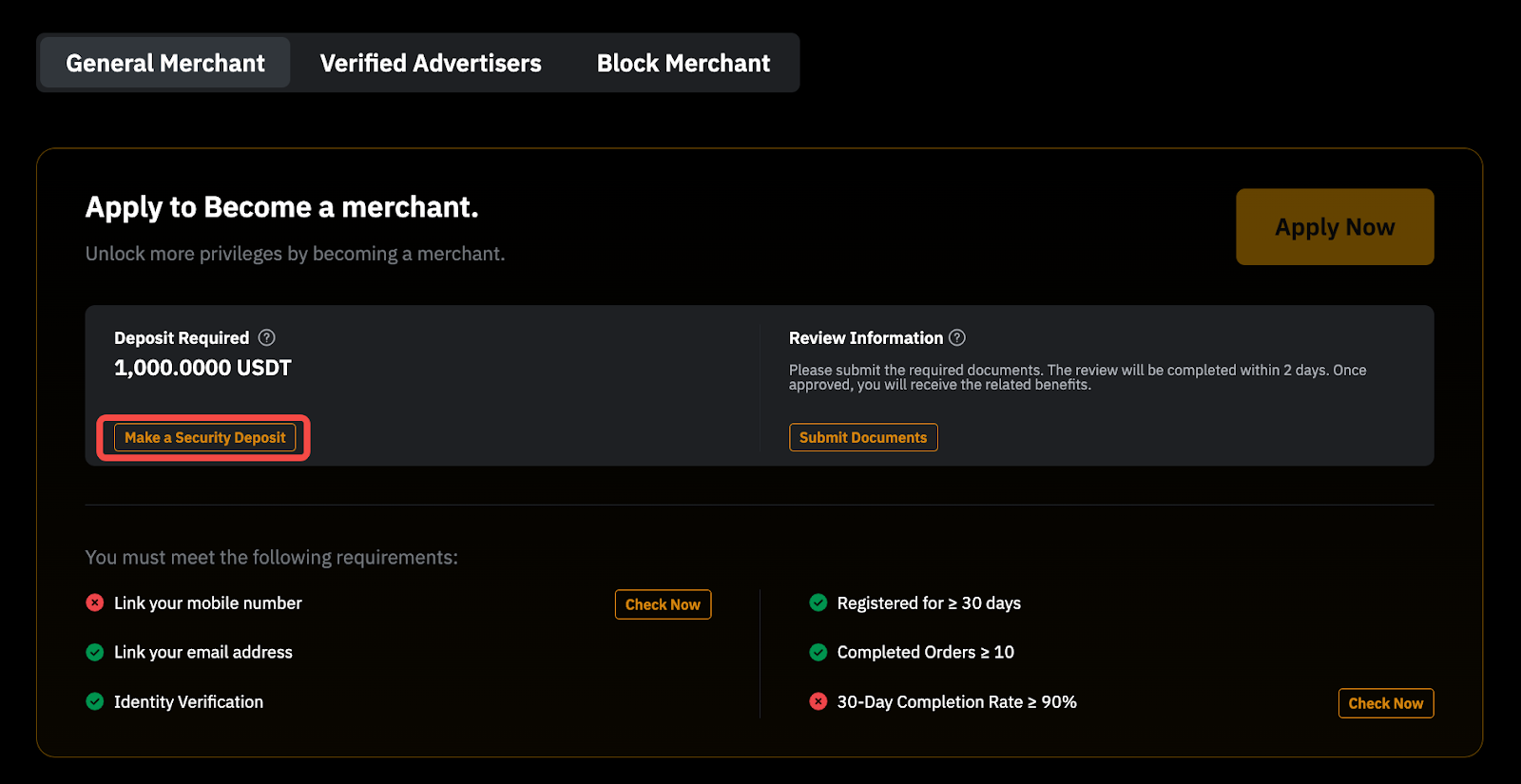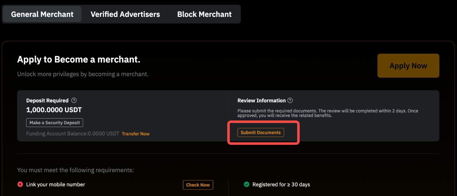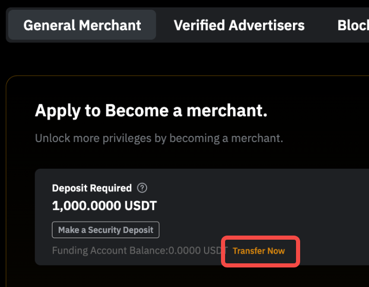 - For a General Advertiser, the required security deposit is 200 USDT. For higher-level advertiser types (e.g., Verified Advertiser or Block Advertiser), the necessary deposit is 1,000 USDT.