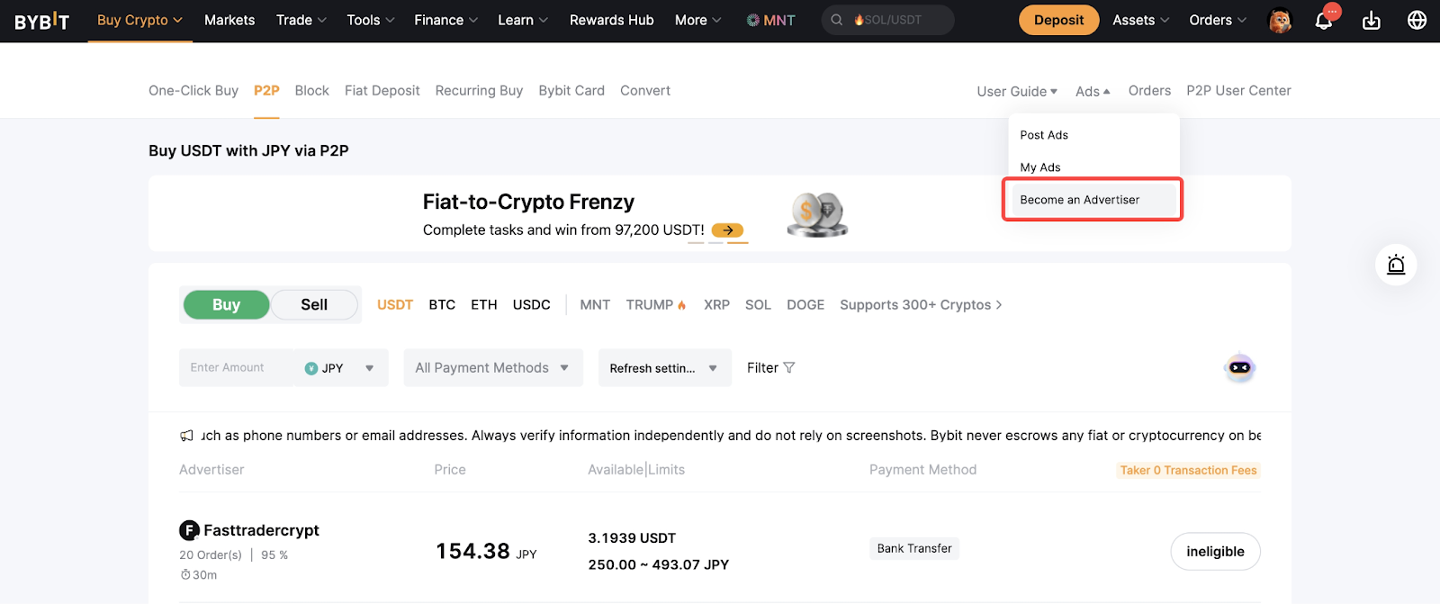 Step 1: Go to the Become an Advertiser page on the Bybit Website, scroll to the bottom, and select the type of advertiser you want to be.