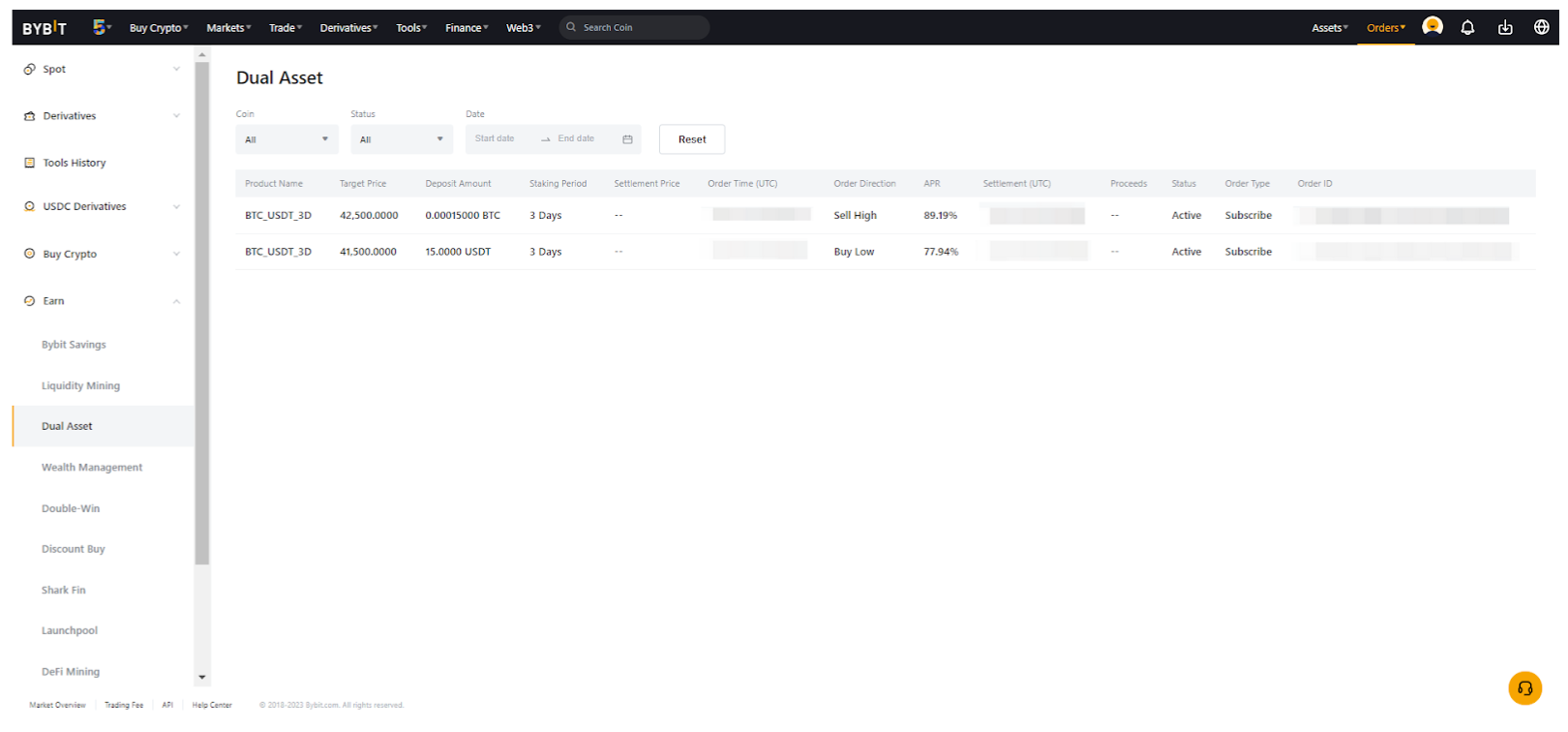 Alternatively, you can click on My Holdings at the top right of the Dual Asset page to enter the Dual Asset Orders page.