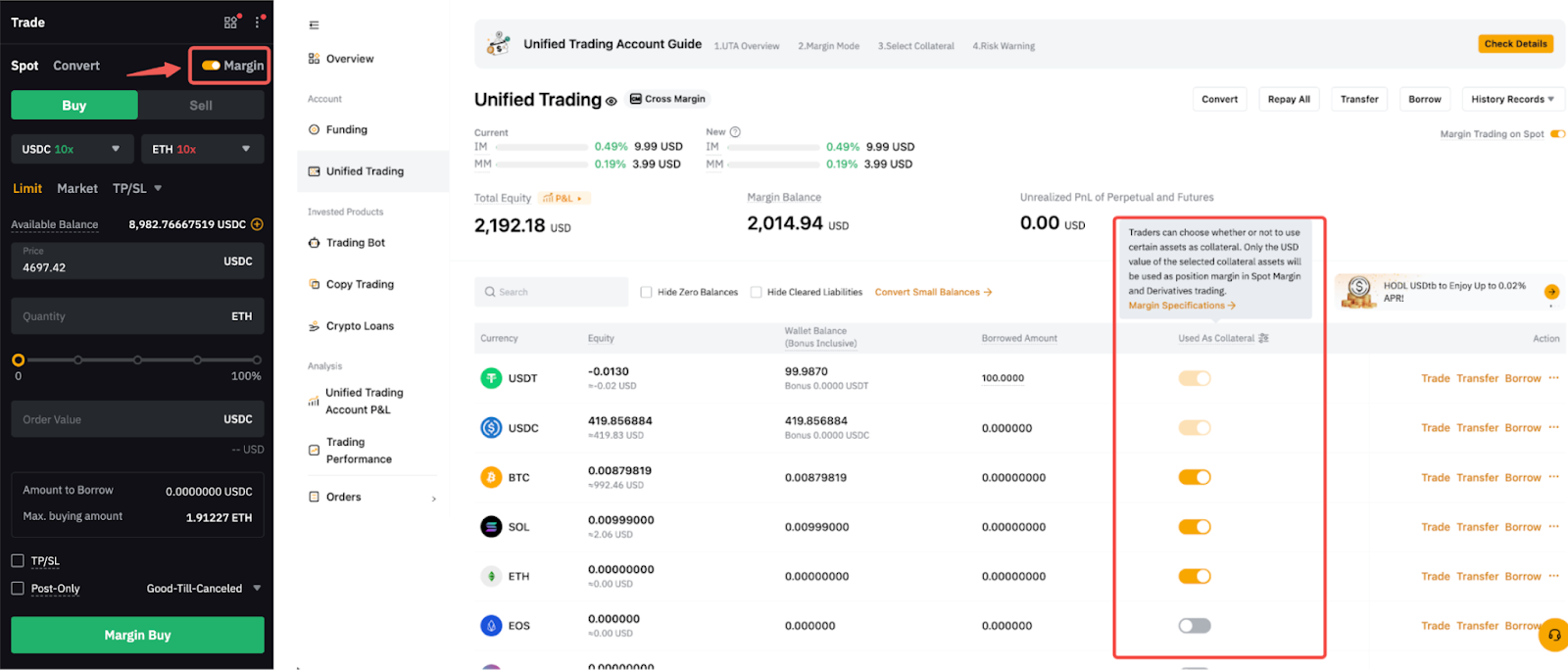 Step 3: Ensure that the Margin tab is toggled on, and that both the base and quote tokens or any other assets that you want to use as margin assets are enabled as collateral.