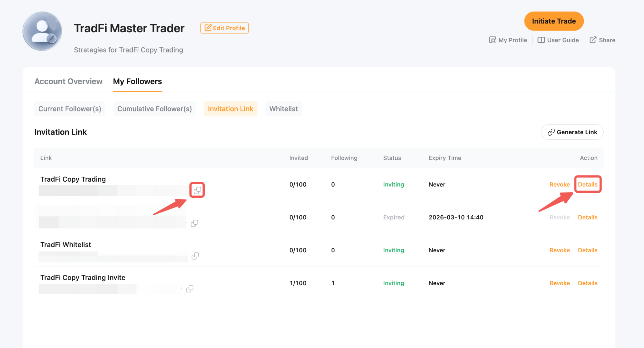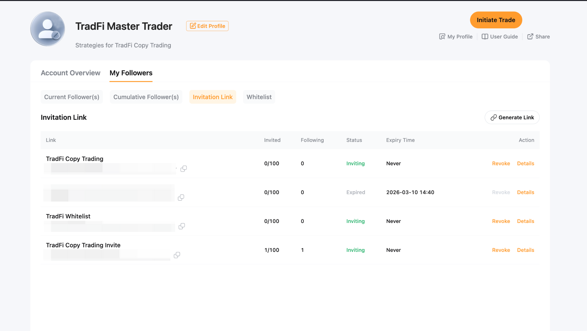 As a Master Trader, you can generate a unique invitation link that allows Followers to copy your trades directly without additional confirmation. If the Follower Whitelist is enabled, Followers who join through the invitation link will be automatically added to the whitelist.