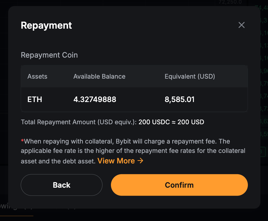 Upon confirmation, the system will use your available borrowed coin for repayment first. Any remaining liabilities will be repaid by converting collateral assets into the borrowed currency. If the repayment requires conversion, Bybit will charge a handling fee on the total repayment amount. The fee rate is the higher of the repayment fee rates for the collateral asset and the debt asset.