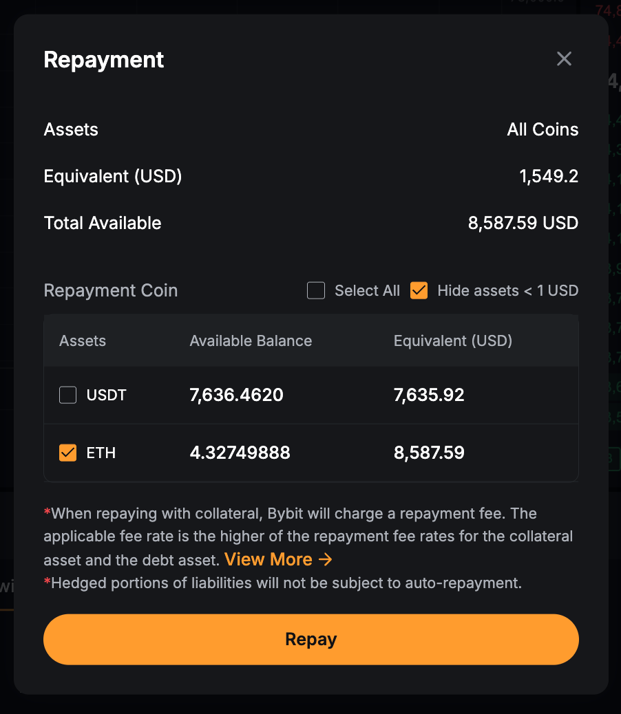 Note: If you have a borrowed coin in your available balance, the asset will be automatically selected for repayment.