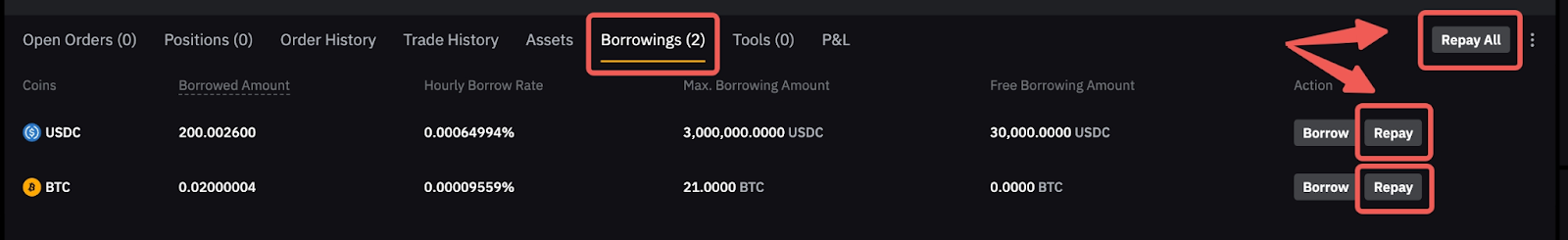 - To repay a single borrowed coin, click on the Repay button beside the column of the respective coin.