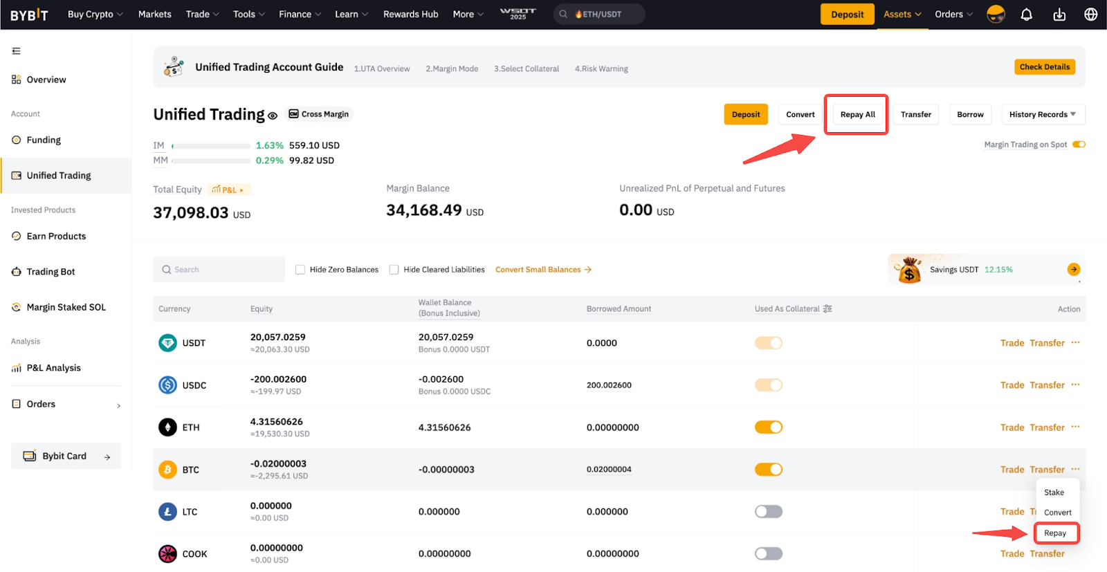 - To repay all borrowed coins, click on Repay All at the top of the Unified Trading page.