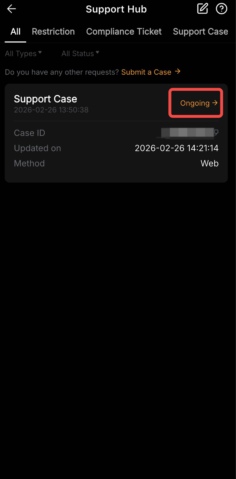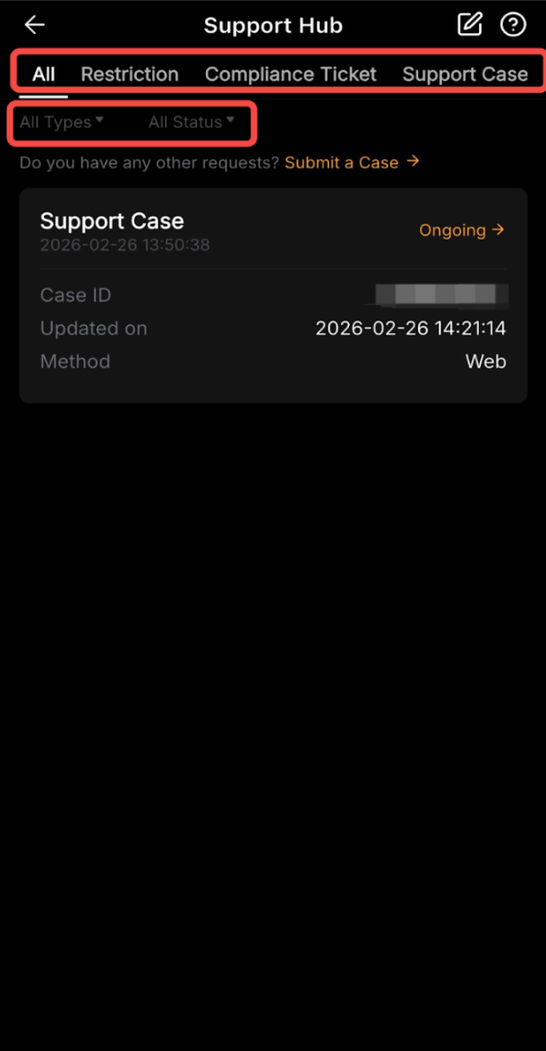 1. Tabs: Choose the specific type of cases you want to view, such as Deposit, Withdrawal, and Support Case, or select All to see all the tickets you submitted.