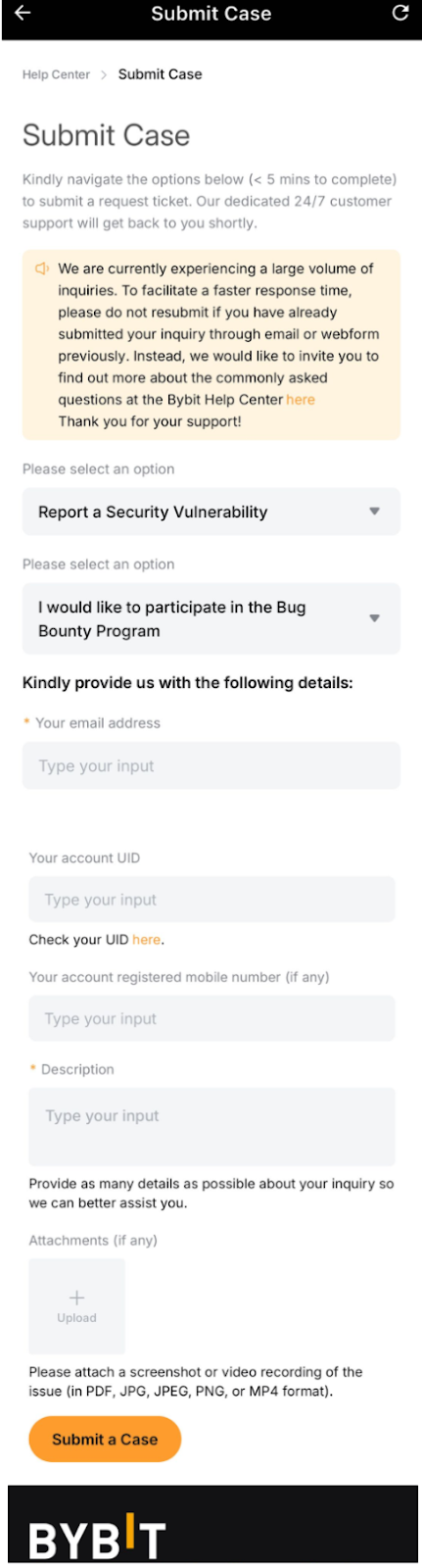 Bybit provides a simple and convenient way for users to submit inquiries and receive support. Follow the steps below to ensure a smooth process and timely resolution of your inquiry.