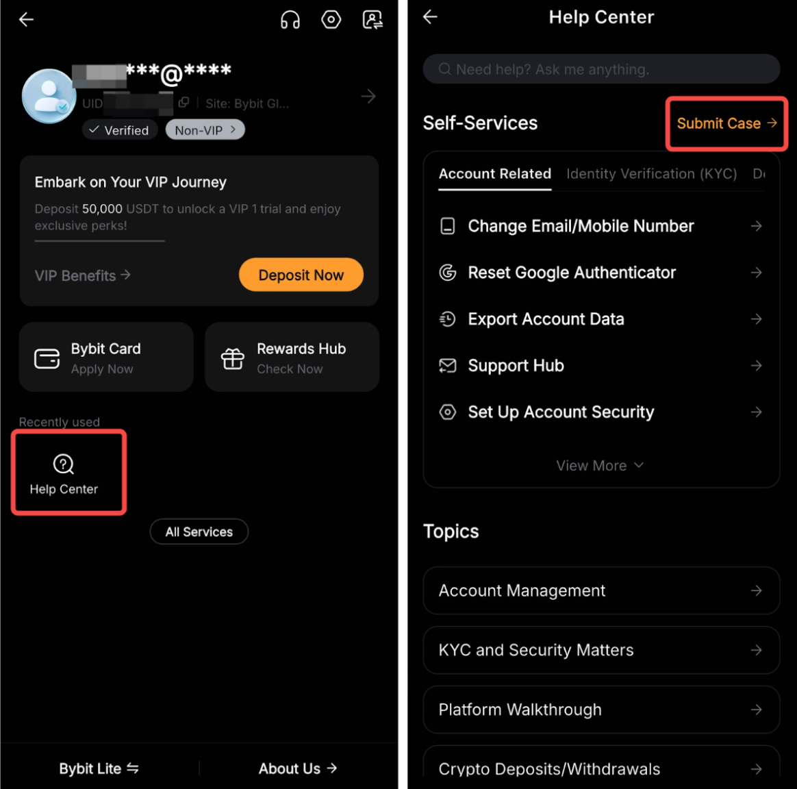 Step 1: Go to your Profile → Help Center and click on Submit Case.