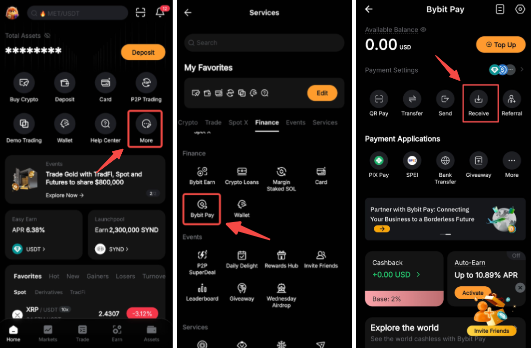 Step 1: Log in to your Bybit App and tap More → Bybit Pay → Receive.
